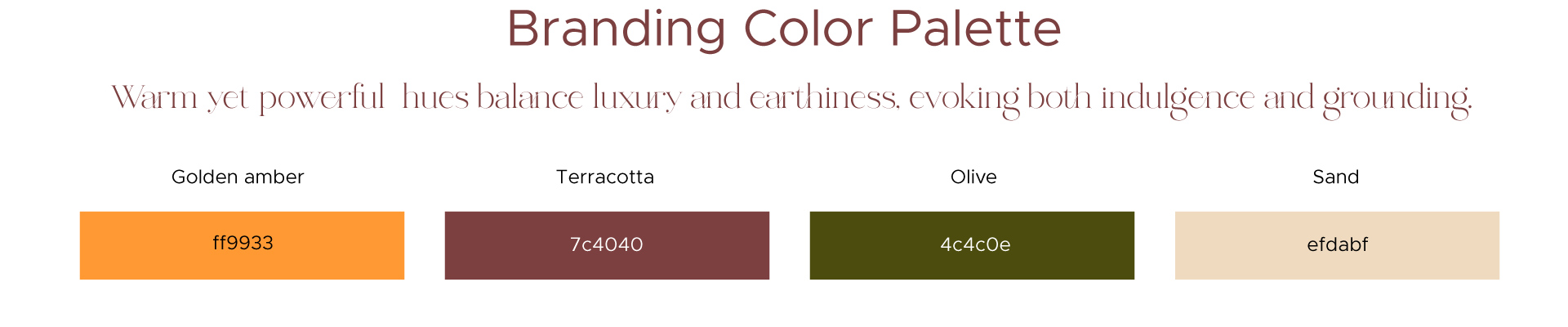 Color Palette: A warm yet powerful blend of terracotta, deep olive, golden amber, and soft cream. These hues balance luxury and earthiness, evoking both indulgence and grounding.